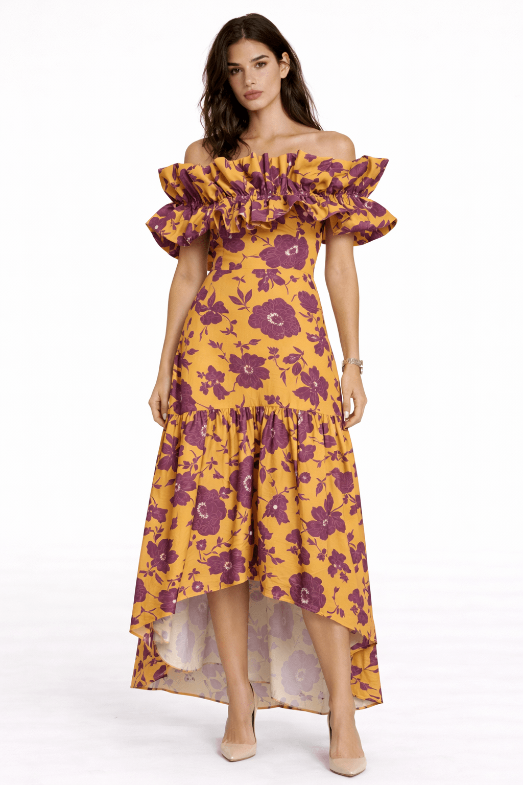 Vestido midi estampado off shoulder con voluminoso frunce en el escote que enmarca los hombros, cuerpo ajustado y falda fluida de vuelo asimétrico. Estampado floral en tonos mostaza y vino que aporta carácter y movimiento. Una pieza ideal para eventos de día, bodas y celebraciones primaverales.